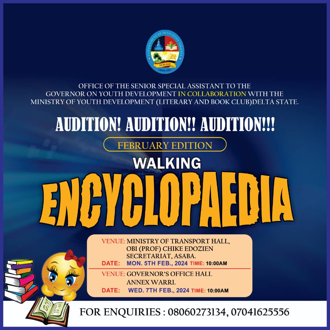 Delta State Government is inviting youths of the state origin between the ages of 15 and 35, who are proficient in writing (Poems, Prose, Essay, Short and Long Stories, Books etc) as well as Public Speaking for auditioning in preparation for the forthcoming International Youth Writing and Speaking Competitions.
