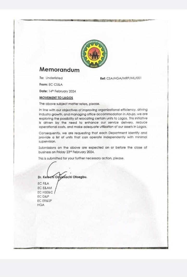 The memo reads “In line with our objectives of improving organizational efficiency, driving industry growth, and managing office accommodation in Abuja, we are exploring the possibility of relocating certain units to Lagos.