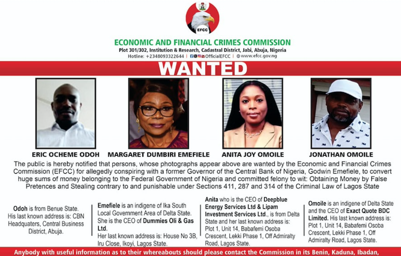 “The public is hereby notified that persons, whose photographs appear above are wanted by the Economic and Financial Crimes Commission (EFCC) for allegedly conspiring with a former Governor of the Central Bank of Nigeria, Godwin Emefiele, to convert huge sums of money belonging to the Federal Government of Nigeria and committed felony to wit: Obtaining Money by False Pretences and Stealing contrary to and punishable under Sections 411, 287 and 314 of the Criminal Law of Lagos State,” a notice by the EFCC reads.